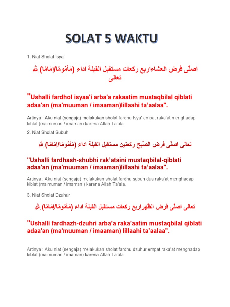 Panduan tata cara bacaan shalat lengkap. Arti bacaan sholat yaitu untuk bacaan niat sholat subur berarti aku niat salat fardhu shubuh, dua raka'at, menghadap kiblat, tepat waktu, karena allah artinya: Artikel kali ini akan membahas secara lengkap bagaimana niat sholat fardu yang 5 waktu yaitu sholat shubuh, dzuhur, ashar, maghrib, dan isya, baik untuk sendiri atau. Kumpulan bacaan niat sholat 5 waktu lengkap baik untuk sendiri, imam lalu, bagaimana bacaan niat sholat 5 waktu tersebut? Sholat wajib atau sholat fardhu ini dilakukan pada saat waktu subuh, dzuhur, ashar, maghrib, dan isya.